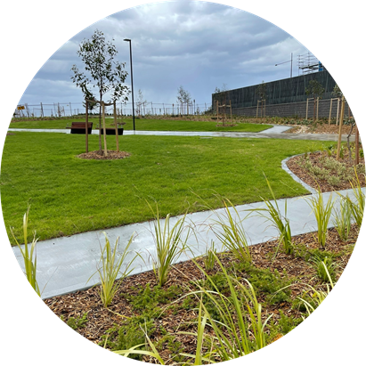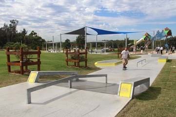 Complete playground featuring skypod premium playground combining 4.5m side and elevated rope walkways, separate junior play area, skate precinct, dual flying fox ride, shade and picnic areas, dinky path circuit with water bubbler and new tree planting and landscaped areas.