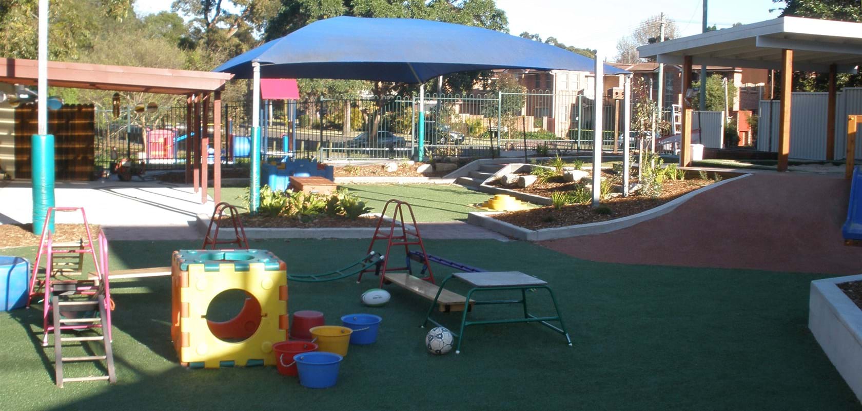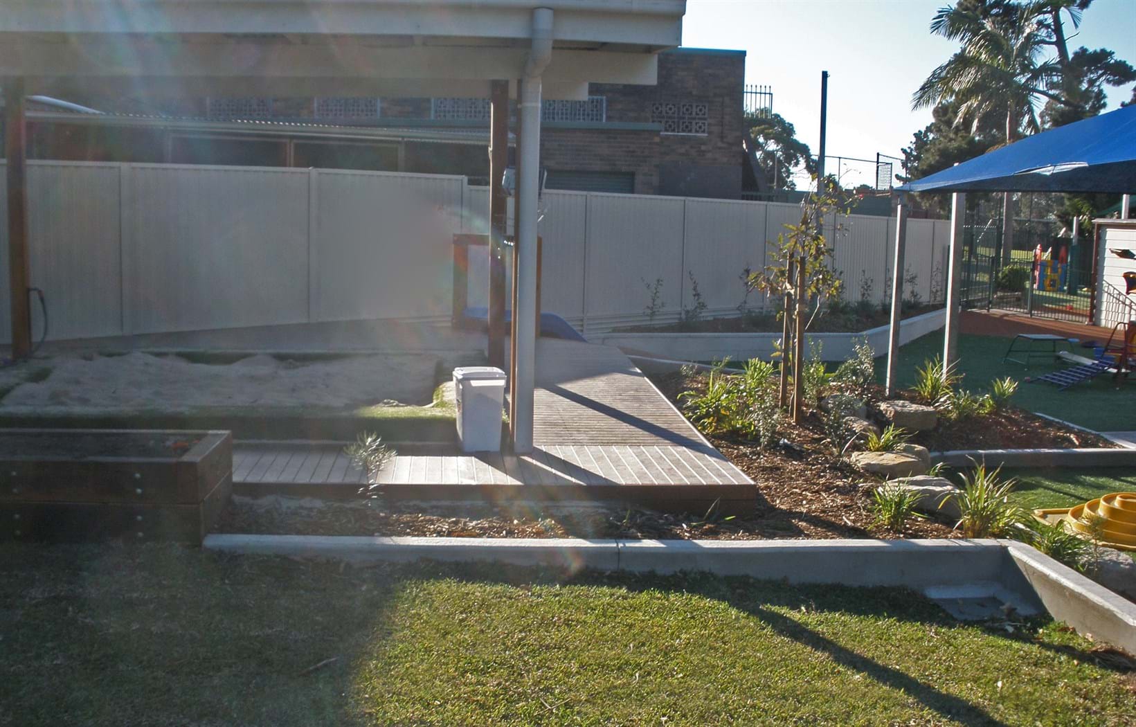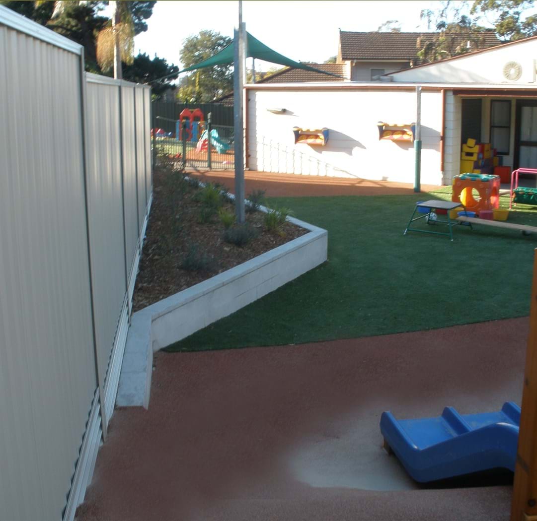 Sutherland Shire Council, required the construction of the outdoor play space at Canberra Road Childcare Centre in Sylvania. The site of approximately 403m2, provides the opportunity for active and passive recreation for children aged between 0-5 years. Site works included: demolition of existing site; earthworks and regrading, including mounding; extensive drainage works including subsoil drains, pits and connection to stormwater; hard works including construction of concrete paths, decking, walls, concrete edging, and footings; softworks including planting, turf, mulch, stone boulders.