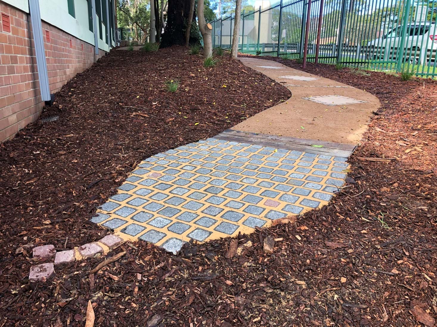 Engadine Public School had unusable areas that required transformation to easily maintainable usable areas that brings imagination to all that use the areas and walkways.