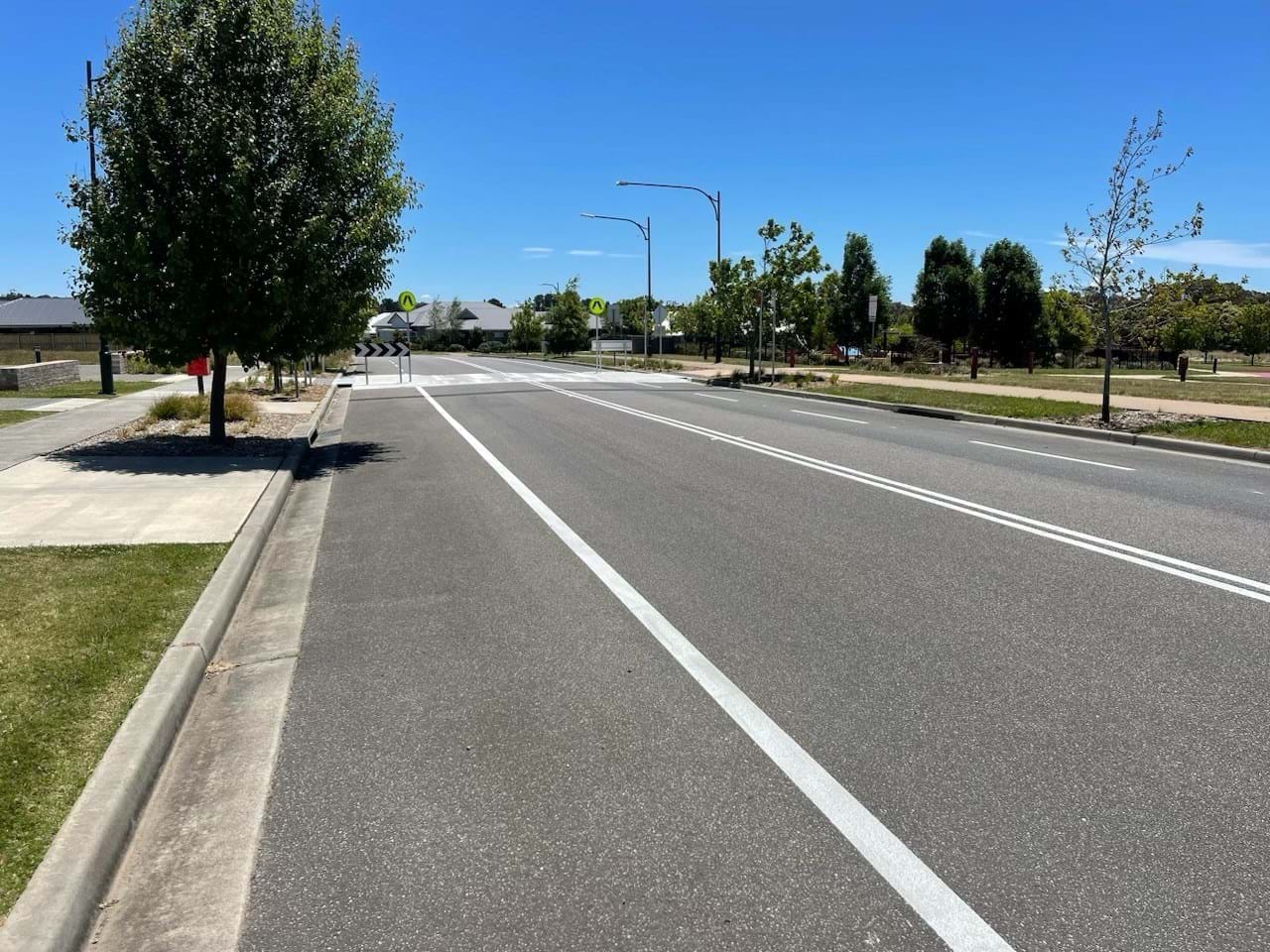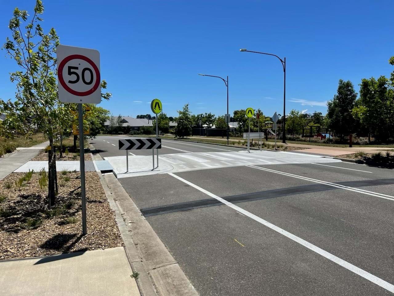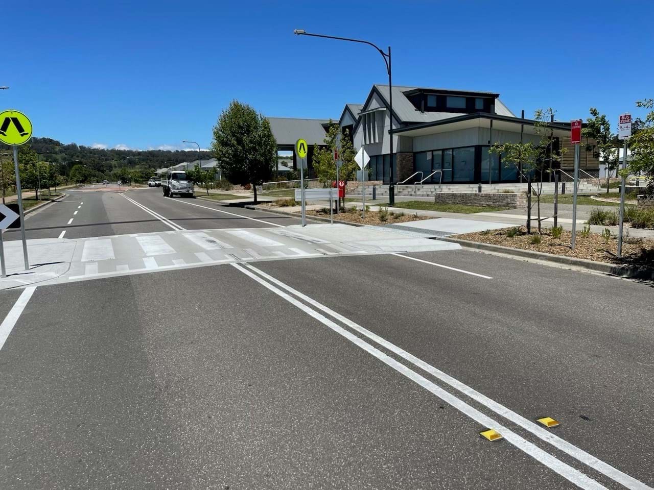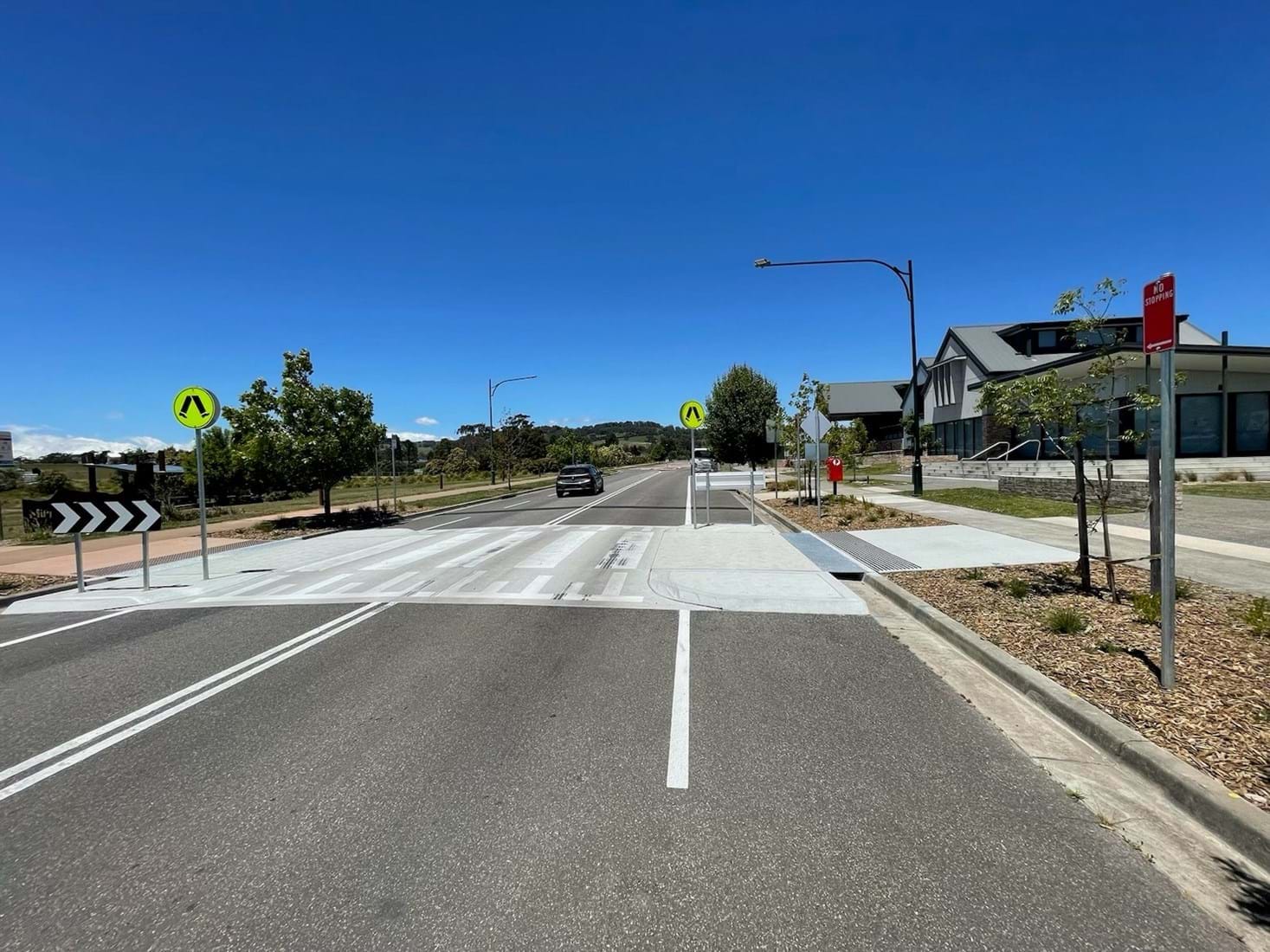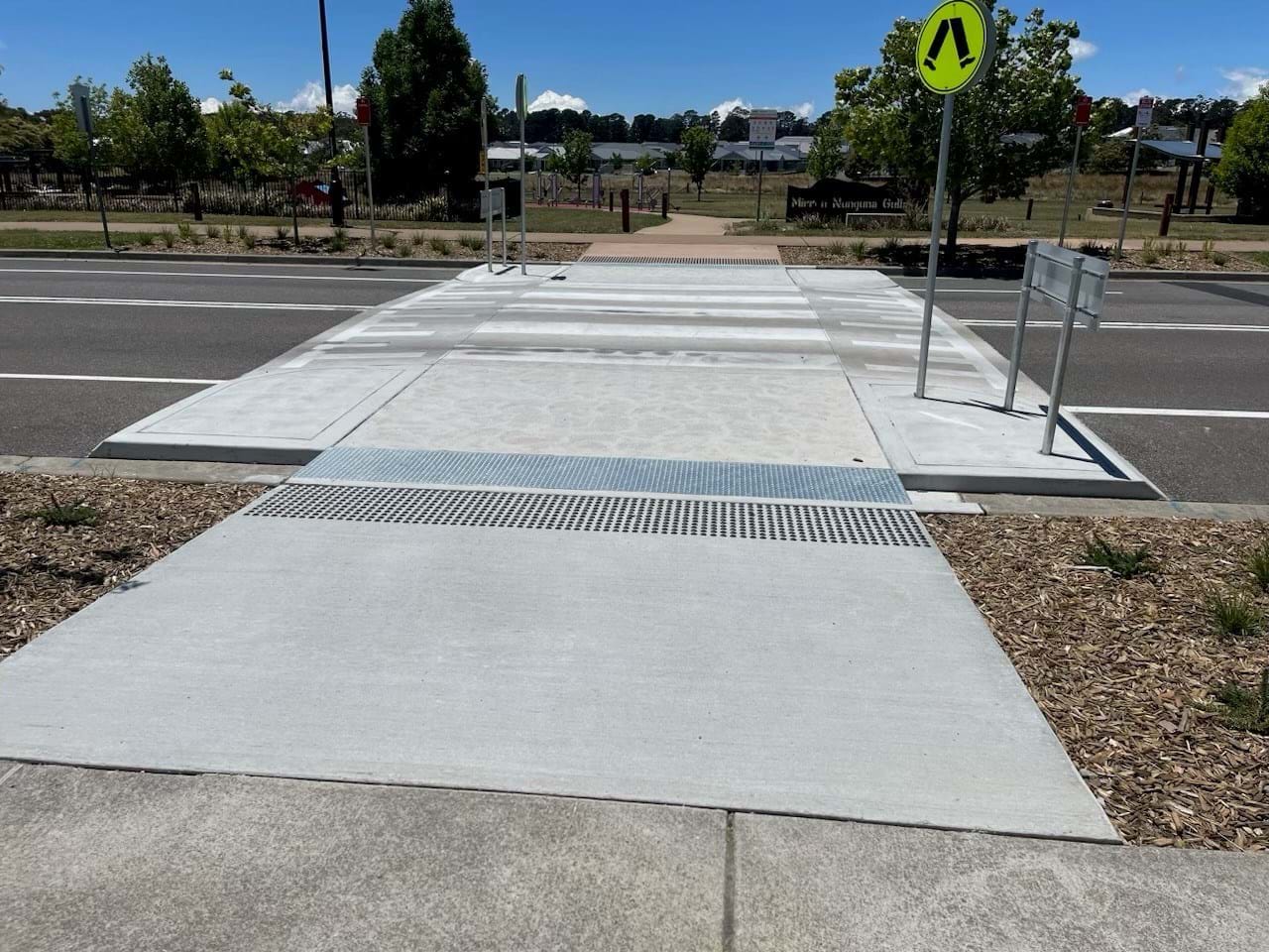 Simpson Landscapes were contracted to demolish existing pram ramp and connecting path on both sides of road, removal of existing trees and garden bed and create a vehicle crossing including kerb ramp, kerb and gutters and footpath paving and drainage. This included traffic management (complete road closure and detours), erosion and sediment control. Line Marking and new signage completed the works with installation of new garden bed and tactiles behind new kerb each side