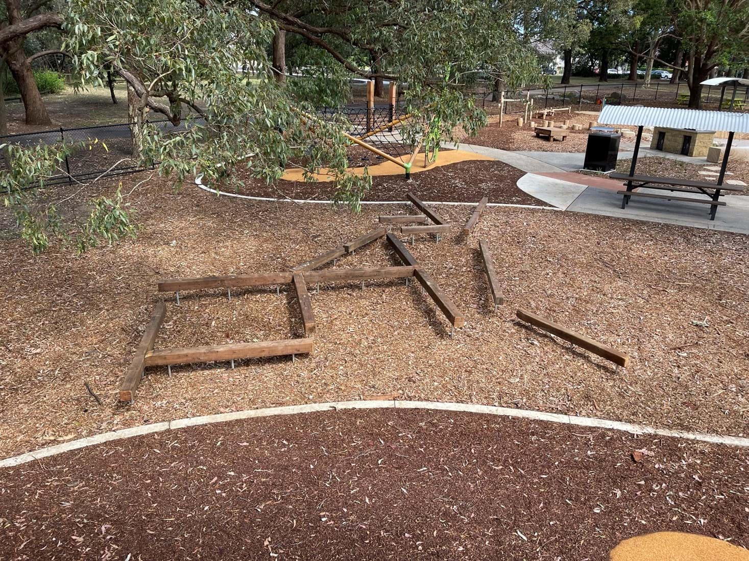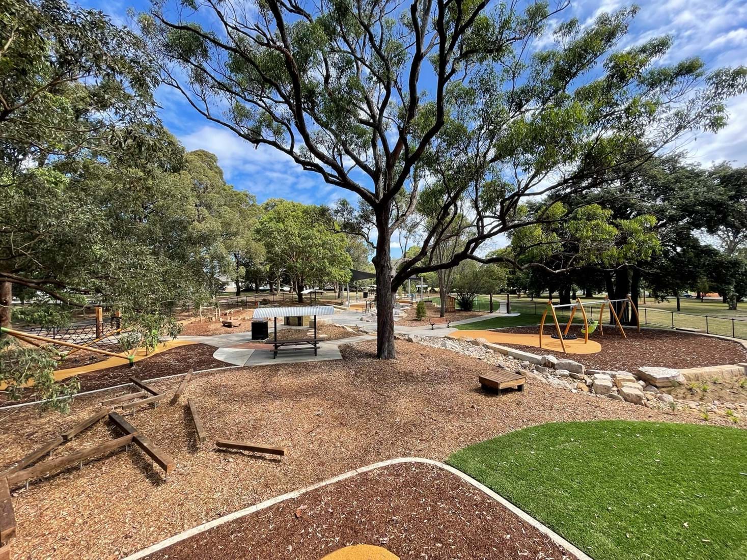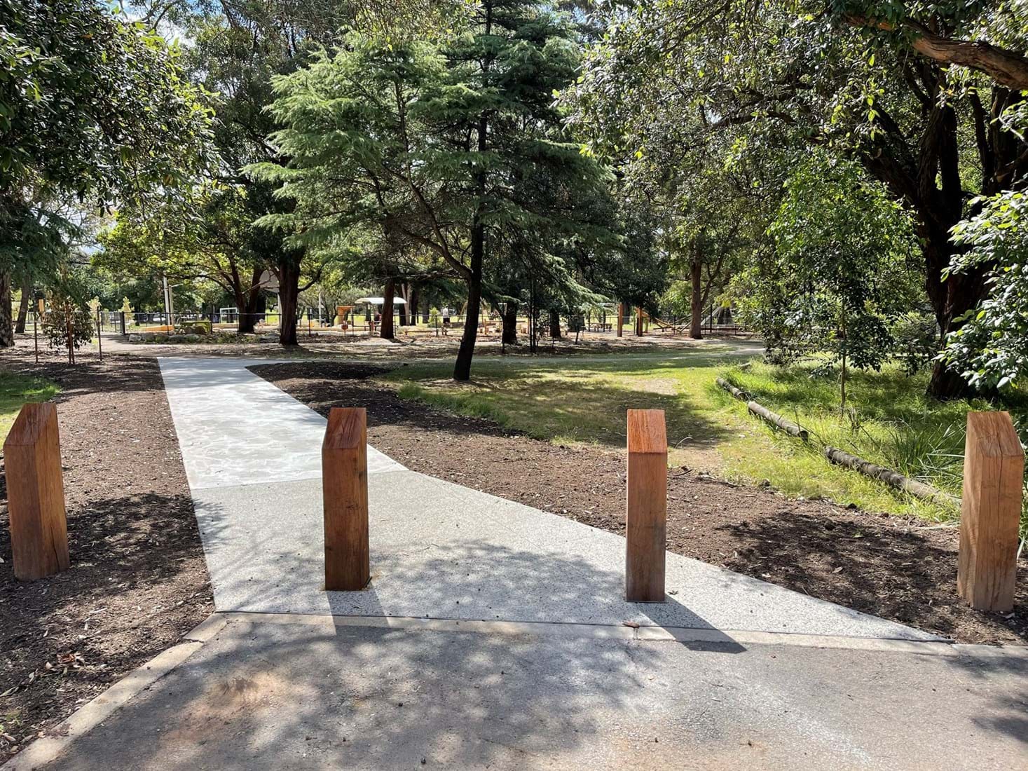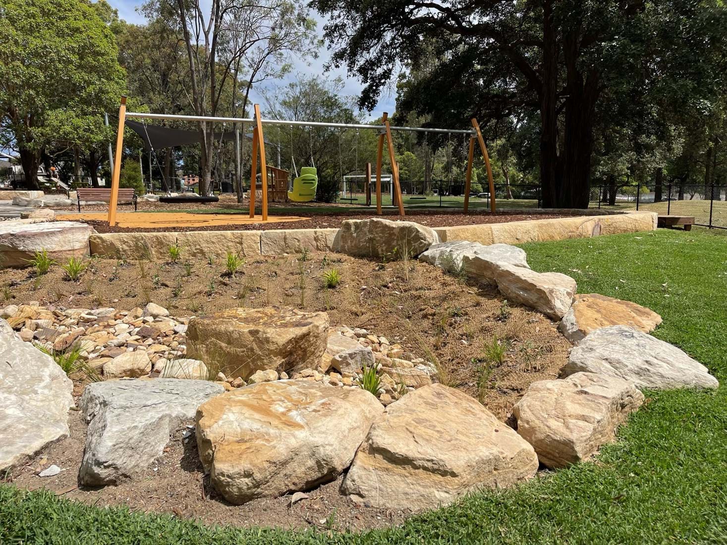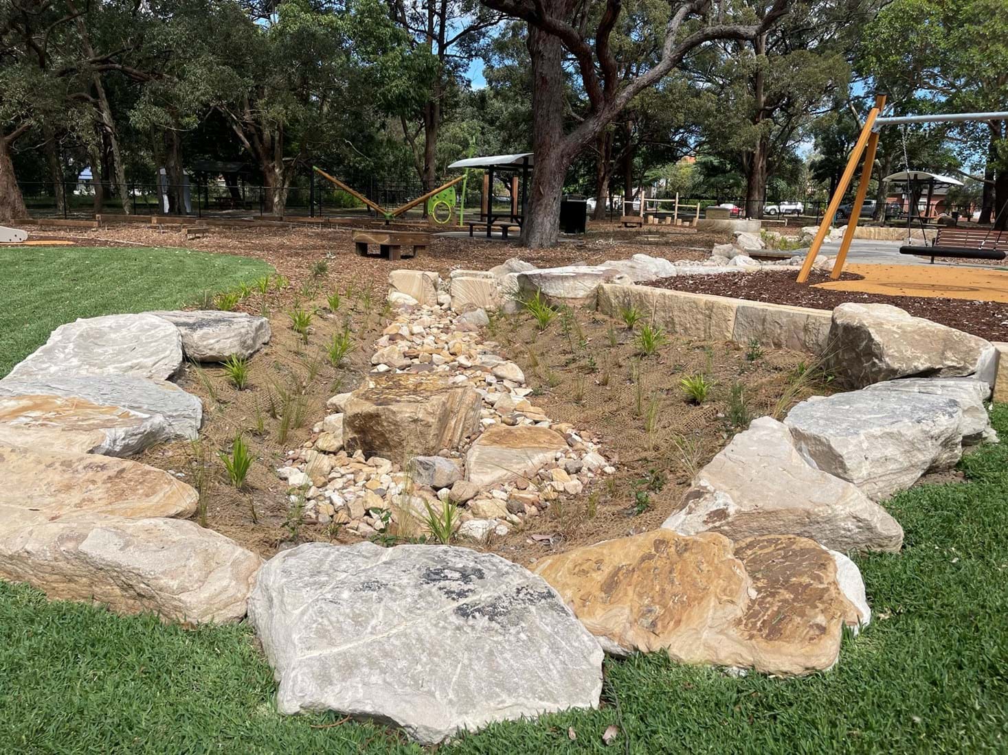 Simpson Landscapes were contracted to demolish and excavate existing park and install pedestrian pathways, drainage, water connections including testing, dry-creek-bed, swale, sandpit, sandstone logs and boulders, wayfinding poles, fencing, mulch, soft fall areas including edging, preparation of base surface, supply and install of furniture, upcycling nominated furniture including balance beams (pictured) prep of garden beds, planting and maintenance.
