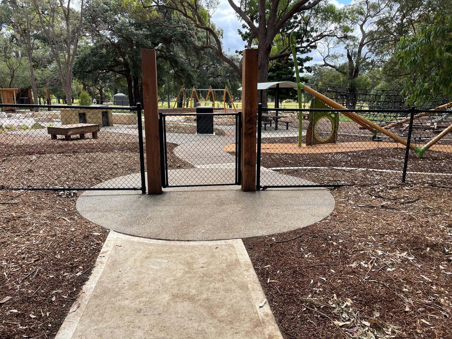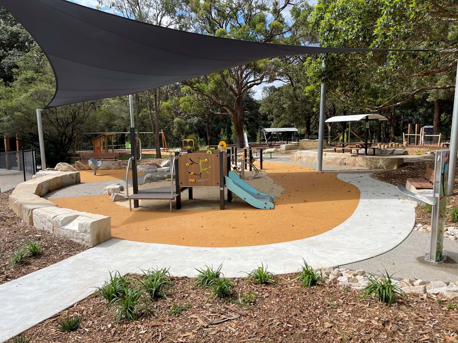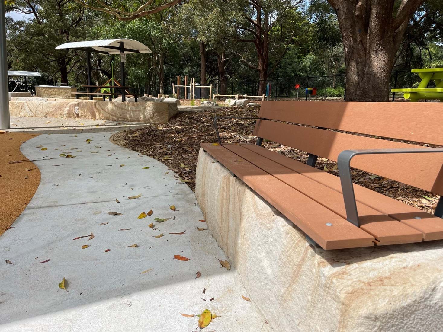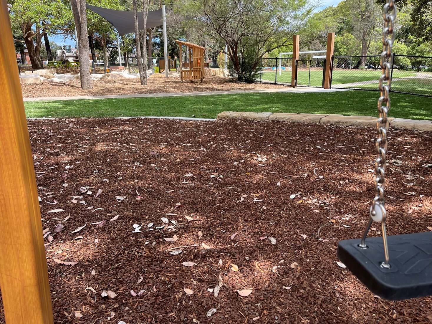 Simpson Landscapes were contracted to demolish and excavate existing park and install pedestrian pathways, drainage, water connections including testing, dry-creek-bed, swale, sandpit, sandstone logs and boulders, wayfinding poles, fencing, mulch, soft fall areas including edging, preparation of base surface, supply and install of furniture, upcycling nominated furniture including balance beams (pictured) prep of garden beds, planting and maintenance.