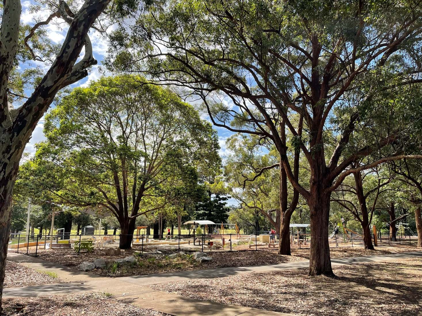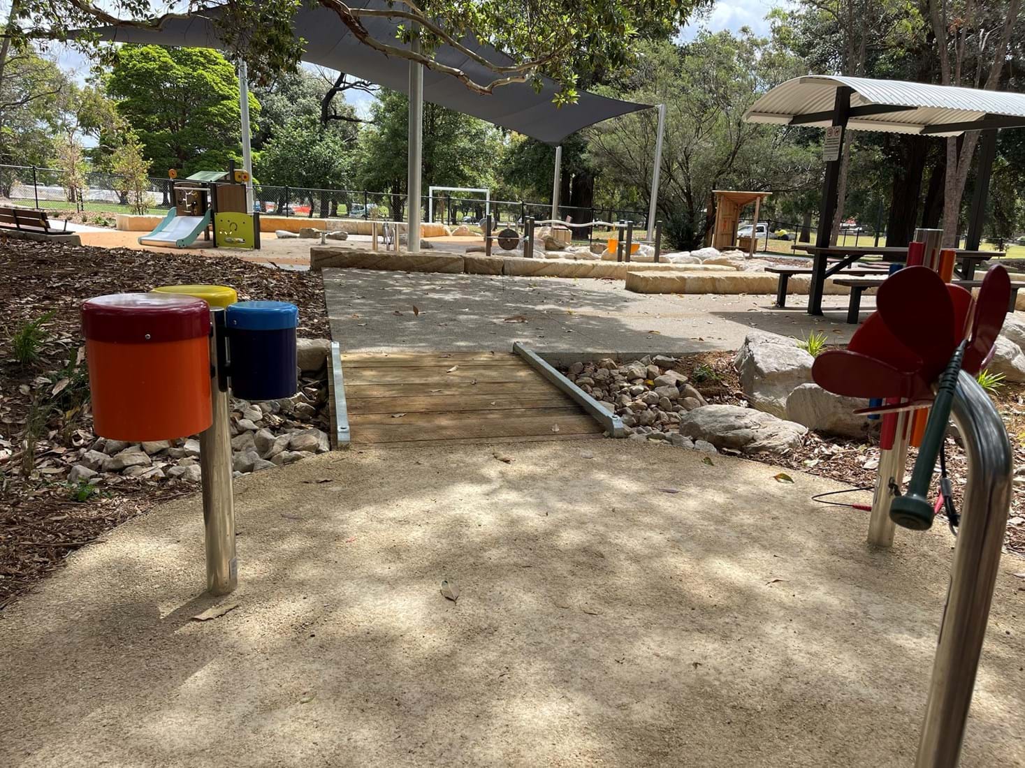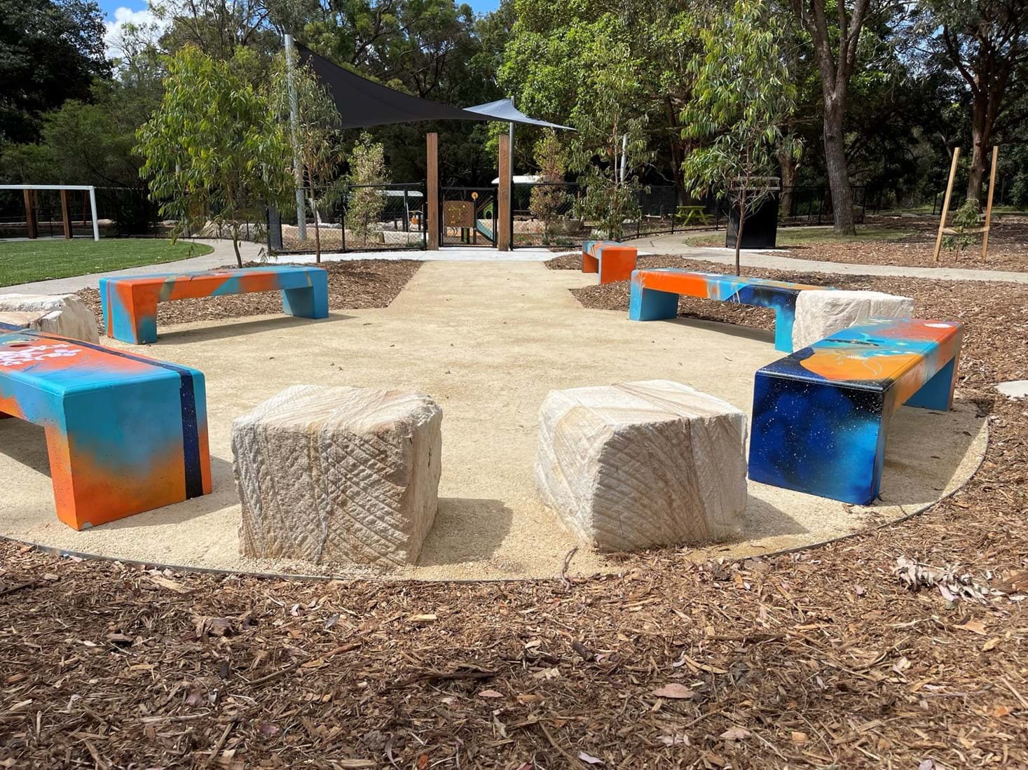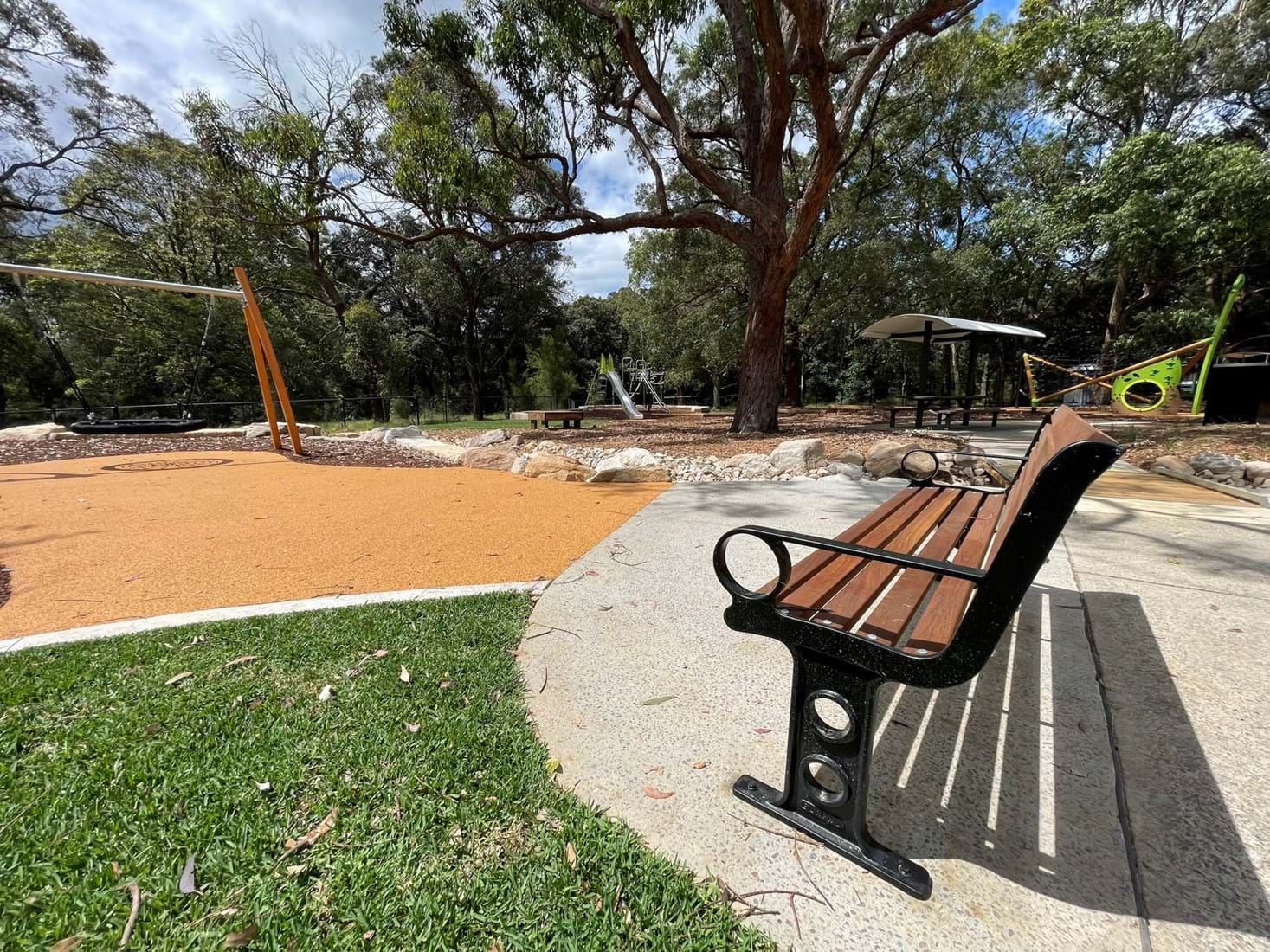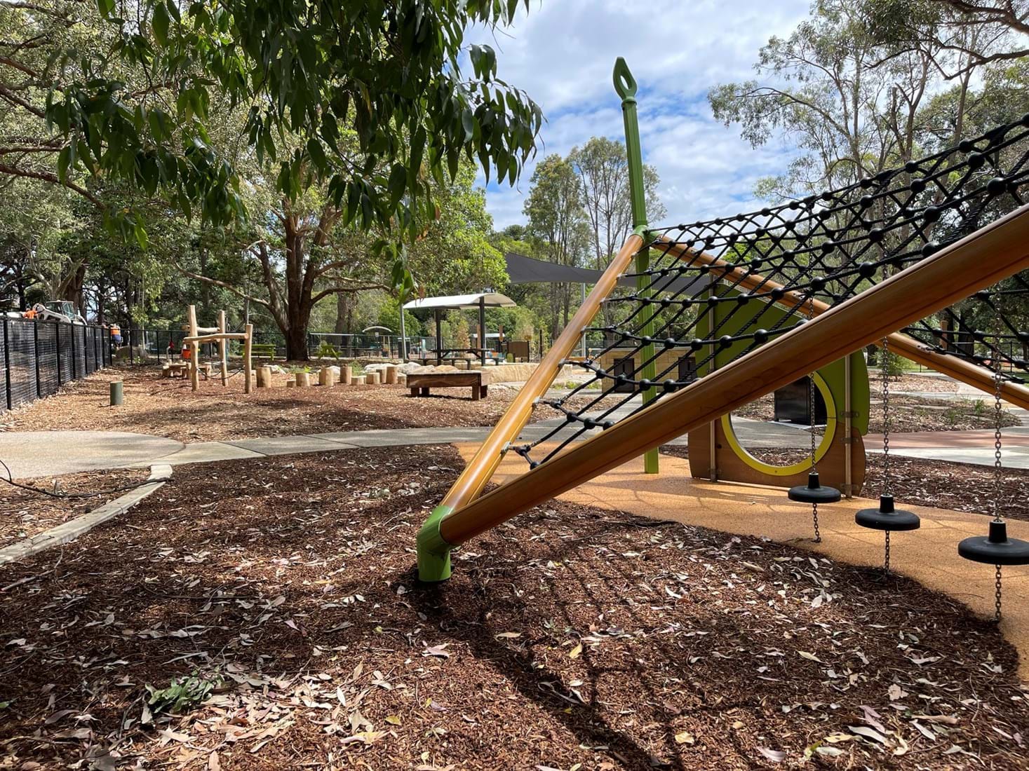 Simpson Landscapes were contracted to demolish and excavate existing park and install pedestrian pathways, drainage, water connections including testing, dry-creek-bed, swale, sandpit, sandstone logs and boulders, wayfinding poles, fencing, mulch, soft fall areas including edging, preparation of base surface, supply and install of furniture, upcycling nominated furniture including balance beams (pictured) prep of garden beds, planting and maintenance.