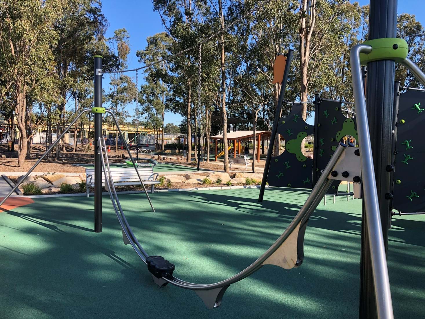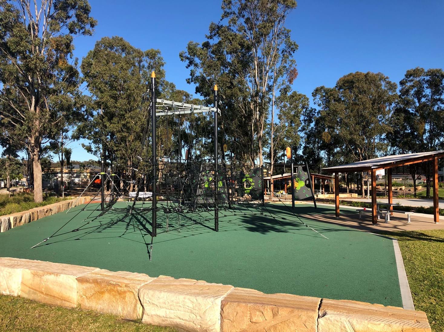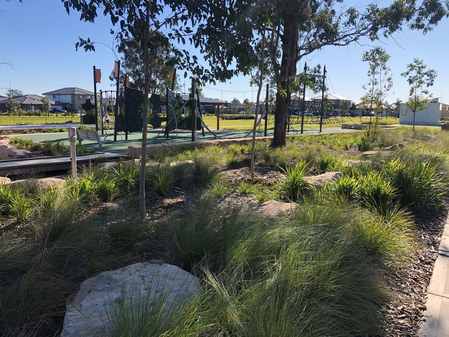 Park and playspace works included furniture and playground equipment, sandstone walls, edging, shelters, concrete cyclepath, full size basketball court, dry creek beds with potable water, paving and safety surfaces, drainage, irrigation and softworks.